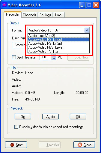DVB Viewer 本身o既錄影只可以儲存成 .ts 格式, 而 Video Recoder 就可以比你揀如 .mpg / .ts / .pva, 又或者純錄聲音o既 .mp3 格式. 不過, 要兩台同錄o既話, 唔可以揀 .mpg, 而 .ts 就得
