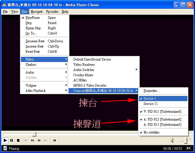 而 Media Player Classic 就仲簡單, menu 裡的 filters 一項可直接揀唔同台同唔同音軌. 注意一點係, 不論 KMPlayer 或 Media Player Classic 播由 DVB Viewer 錄出o黍o既片段都出唔到 subtitle 字幕