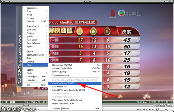 錄完要播放的話, 當然可以嚮番 DVB Viewer 裡面放, 但係筆者嚮 DVB Viewer 搵唔到轉台o既選項, 下面只可以用 Media player classic 同 KMPlayer 作示範. KMPlayer 可以嚮 Filters 揀 Cyberlink Demux