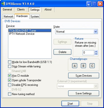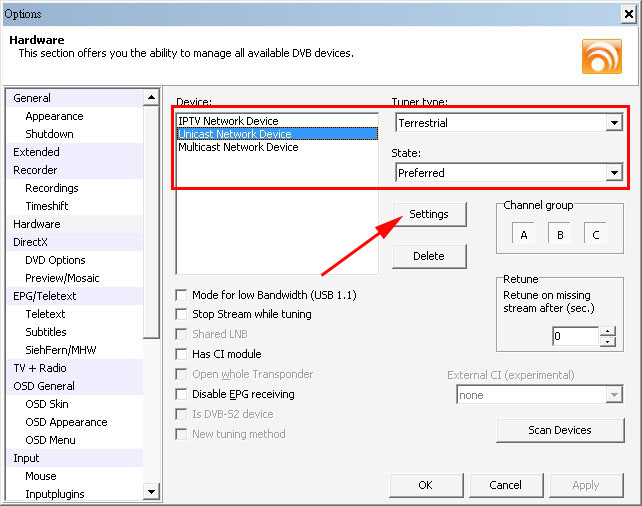 Hardware 裡面 Device 選取 “Unicast Network Device”, Tuner type 揀 “Terrestrial”, 而 State 則揀 “Preferred” (如果 client 部機有其他數碼電視接受設備, 請先將此類 device 為 ” Do not use”, 之後按 “Settings”