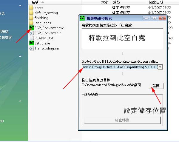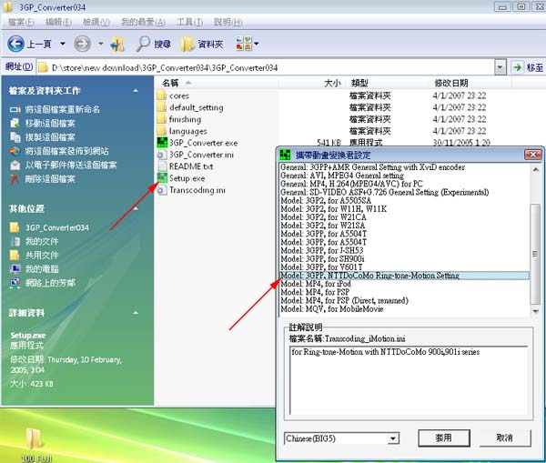 打開 3gp converter 的 folder, double click setup.exe 先設定輸出格式. 必須選擇 Model: 3GPP, NTTDoCoMo Ringtone-Motion Setting