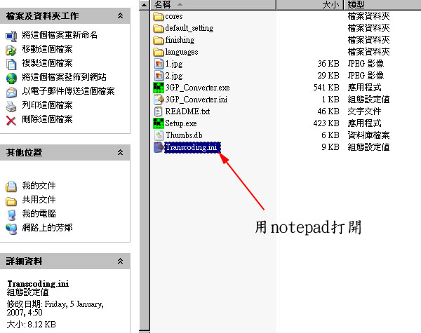 於3gp_converter 的 folder內, 用 notepad 之類的程式打開 Transcoding.ini, 會看到如下的文字: