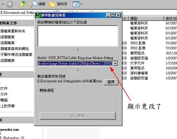 方便記的話, 可把 TitleE=Audio+Image Picture Audio/80kbps(Stereo) 500KB 修改為 TitleE=Audio+Image Picture Audio/128kbps(Stereo) 1200KB, 這樣在主程式會更直觀, 如下圖
