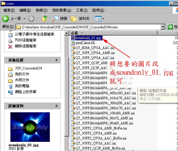 若想改用自己的圖片來代替程式預設的圖片, 只要將你要的圖片的名稱改為 sound_only.jpg, 把它放入 cores 的 folder內就可. 圖片的尺寸不要太大, 因程式會把它轉成 177×144