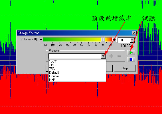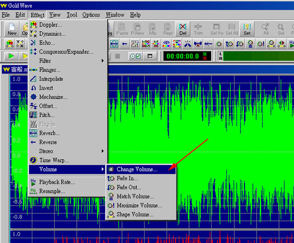 如發現原本的音效聲音不夠響, 可在 goldwave內把它調高, 如圖 Effect > Volume > Change volume