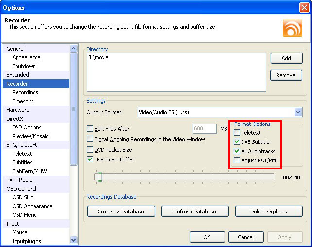 設定錄影選項, 如錄影位置, 格式等. 錄影如需要多聲道及字幕, 記得 tick “format options” 裡的 dvb subtitle 及 all audiotracks