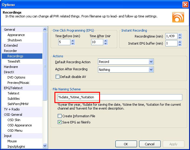 file naming scheme 有一項要注意, 就係default 裡有 _%event, 呢個要刪除, 否則錄影會有問題. 當然, 如果你用o既epg 係英文, 就應該不在此限