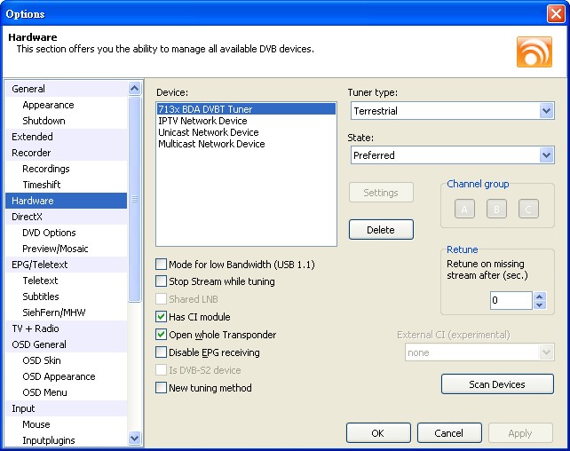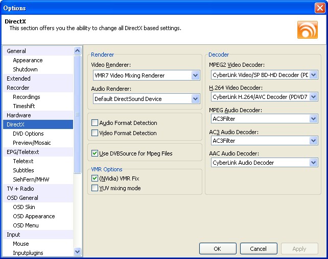 DirectX設定方面, 最好已經安裝 PowerDVD (支持硬解) 同 ac3 filter, 咁就可以自訂佢o地為解碼 decoder. Renderer 方面, 經過實際經驗, 睇標清台用 overlay, 高清台用 vmr7 流暢度最好. (要capture 的話, 一定要用vmr mode)