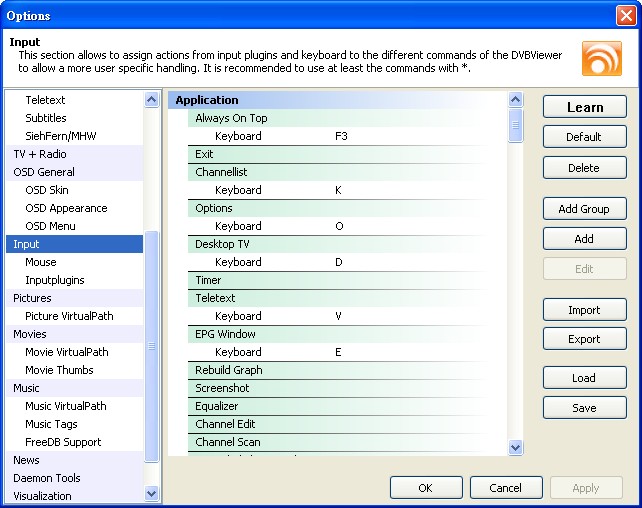 DVB Viewer 支持 hotkeys, 可自行更改及學習字鍵組合, 非常方便