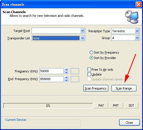 安裝後可進行’搜台’, 按”Scan Range” 就可. 香港一共有13個免費數碼台