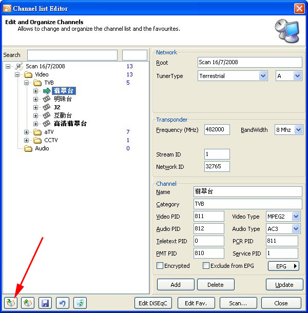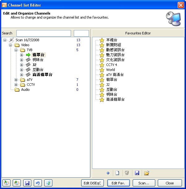 “掃台”後, 台名會係英文, 可以用 Channel Editor 更改台名成為中文. 唔想自己改, 可下載 channels.rar 改好的, 之後嚮 channel editor import 就可 (當然要先unzip同筆者收o既係慈雲山發射站, 其他地區未必o岩用) *09年4月1日亞視數碼台有改動, 新的 channel list 請這裡下載
