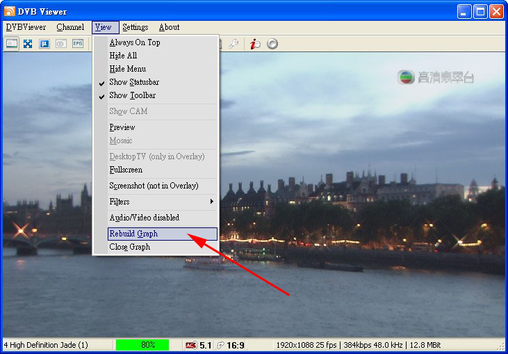 如收看過程中有”爆格”情況, 可以轉台或在pull down menu 裡的 Rebuild Graph 解決 (註 : 也可以轉 audio track 去解決出現爆格情況, 轉 channel 會比 rebuild graph 快)