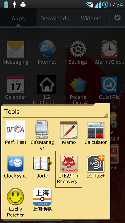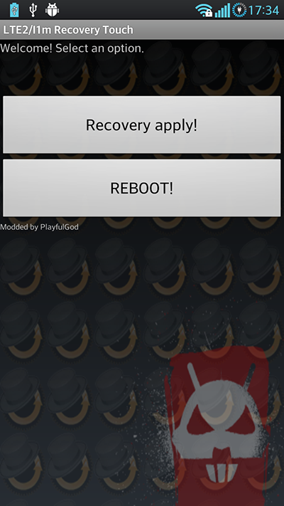 執行後會有兩個選擇, Recovery apply! 同 Reboot. 第一次安裝後就先按 Recovery apply!, 之後就可以按 Reboot 重啟部電話並入 recovery mode. 如熄機狀態按power 制開機, 見到 LG logo, 按home 鍵亦可以進入recovery mode