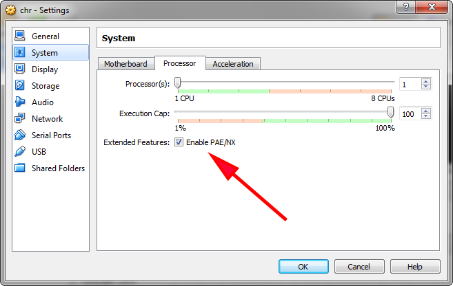 新增virtual machine時必須更改一預設設定, 就係”Enable PAE/NX”, 否則起唔到Chromium OS. Virtual machine type 可揀 Linux, version揀 Ubuntu就可以