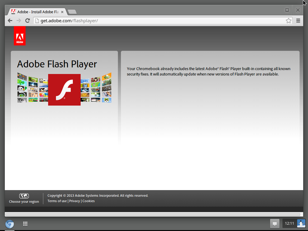 正如上面所講, license問題, hexxeh無改flash加入chromium OS. 但你去Adobe想安裝Flash, 佢又會話”你的Chromebook已經有flash player”.