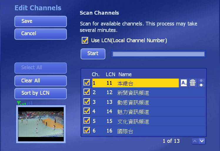 初次設定會叫你”掃台”, 而進行搜台及設定時, Use LCN 呢個選項比 DVB Viewer 好, 因為使用本地電視台的預設台號, 對有機頂盒 (STB) 的用家會較方便. 唔想自己改台名, 可下載這個已經改好的 : tm35.rar